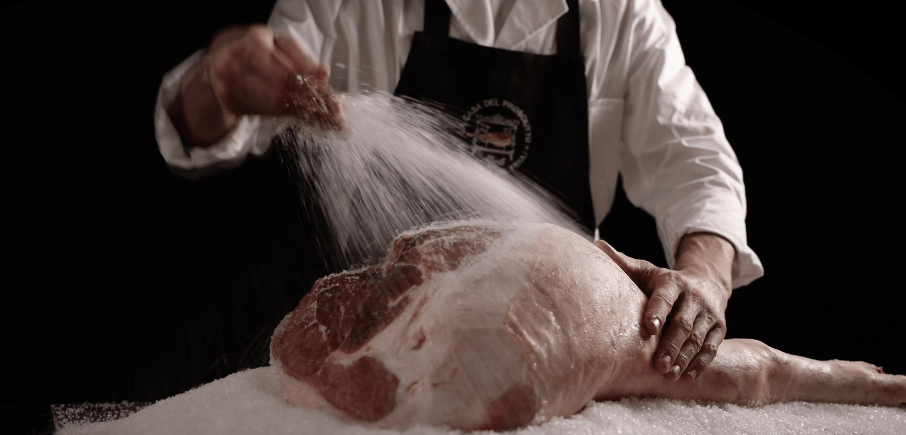 La dolcezza del nostro prosciutto nasce da un gesto semplice ma fondamentale: la salatura. Ricopriamo ogni coscia con sale marino e la lasciamo riposare al fresco, a circa 2°C, per un tempo che varia in base al suo peso.