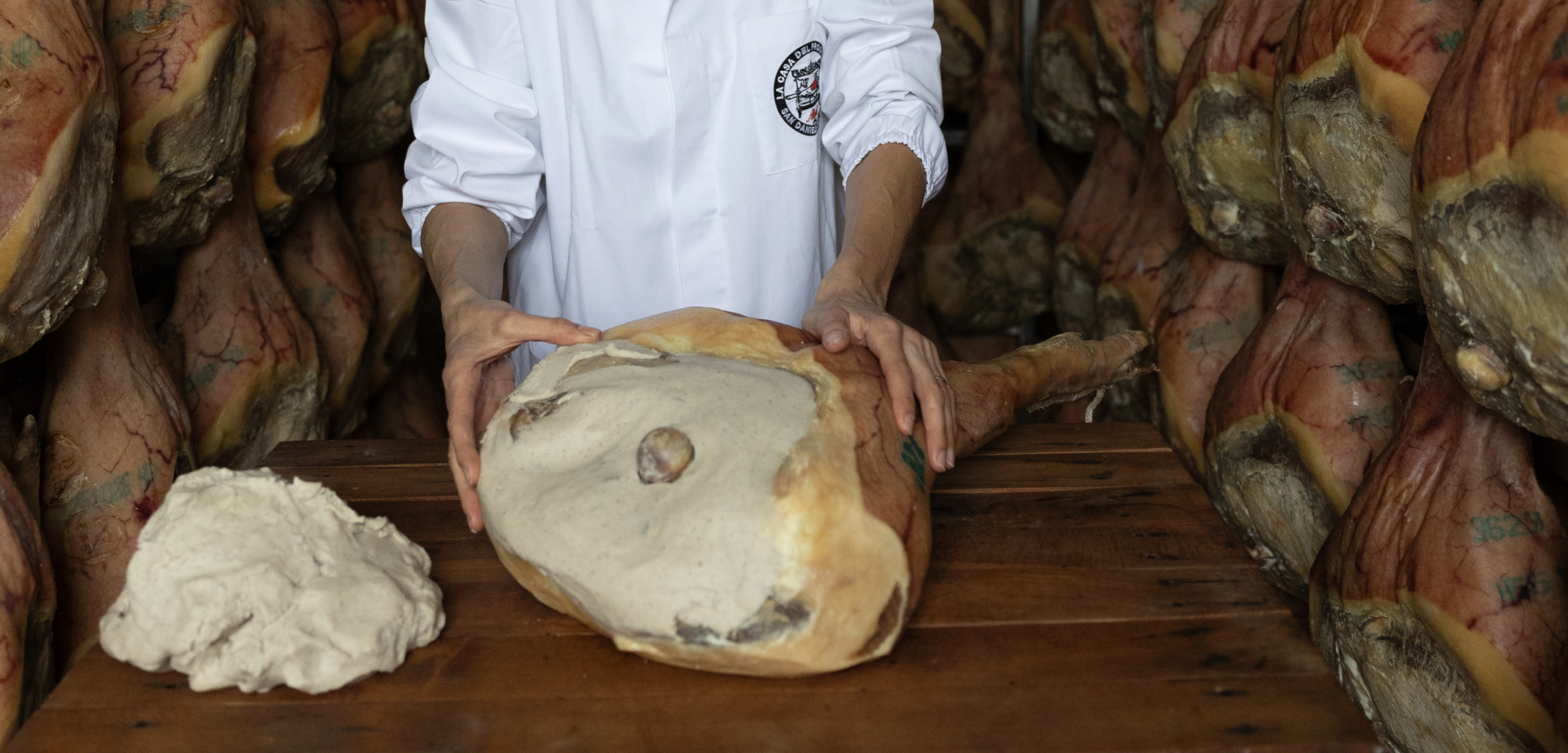 Durante la stagionatura, proteggiamo ogni prosciutto con uno stucco fatto a mano: grasso di maiale, sale, pepe e farina di riso. Un sapere antico che aiuta la carne ad asciugarsi lentamente, mantenendo la sua morbidezza.
